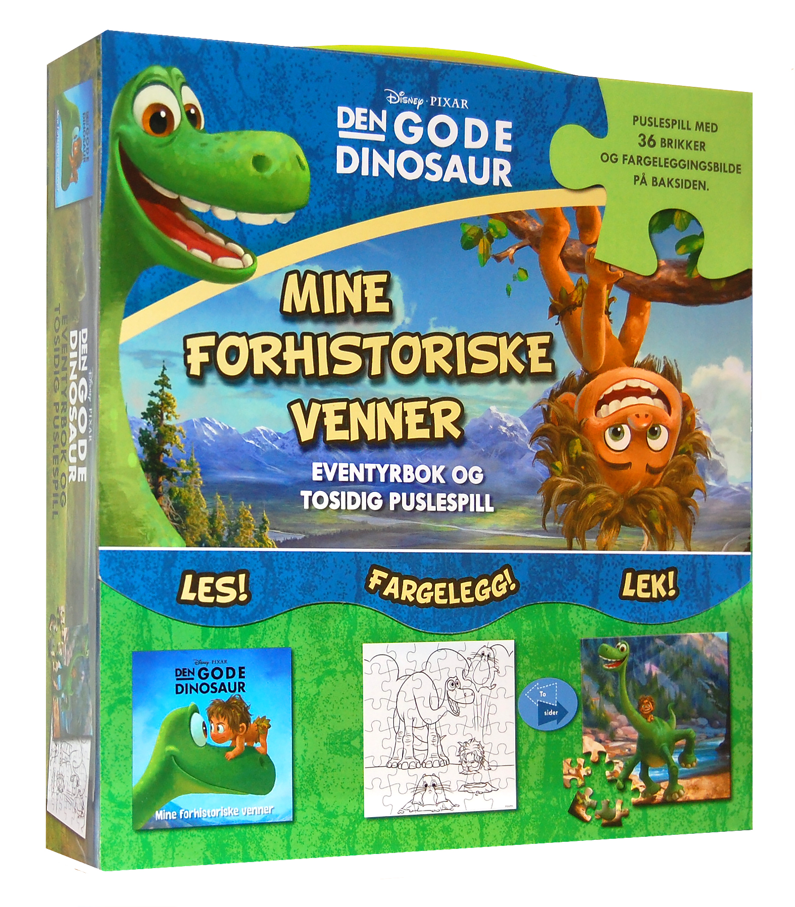 Les det rørende eventyret fra Disney/Pixar-filmen i boka som følger med – om den engstelige apatosauren Arlo som blir tatt av elven og ført langt bort fra familien, og som må slå seg sammen med det lille menneskekreet Tass for å klare seg i ødemarken. Når du har greid å sette sammen puslespillet av 36 brikker i solid papp, kan du snu det og fargelegge motivet på baksiden – og pusle sammen det også!